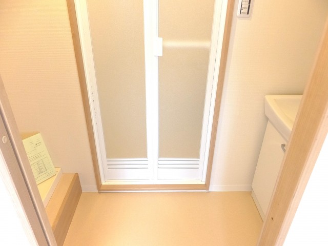 入って左側は洗濯機置場、右側が洗面台です。洗面台はシャワーノズルになっているので、お掃除がラクラクですね☆