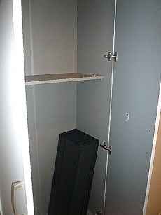 ホワイトな玄関収納です。今は中にある板が外れていますが、板の高さはシューズに合わせてセットできそうです。