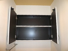 玄関入り左側にあるウォシュレット付トイレです。吊戸棚は壁の端から端までありトイレットペーパーストックも沢山できそうです。