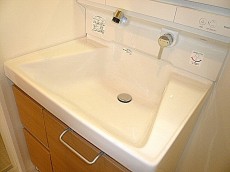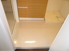 ピカピカの床に一歩入ると目の前には洗面化粧台、お隣に洗濯機置き場、左には浴室があります。