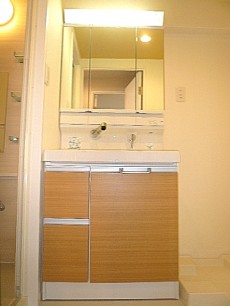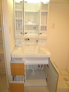 洗面化粧台です。ウッド調の収納はソフトなイメージを持ちますね。スタイリッシュな洗面ボウルはオシャレです。みやすい三面鏡の扉をあけるとこちらには化粧水やヘアースプレー、歯ブラシなども収まりそうです。