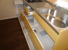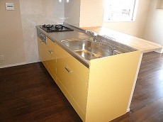 カウンター付システムキッチンです。キッチン左上に吊戸棚が設置されています。コンロ・シンク下はスライド式収納となっていて、奥までしっかり収納できます。みやすくひと目でわかるので整理整頓もしやすいですね。明るいウッドのカウンターにはハイチェアーを置いたり、カウンター収納などもできそう。シンクも広々、洗い物もはかどりそうです!