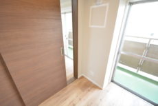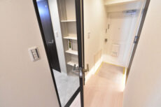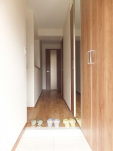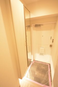 玄関右には収納とミラーがあります。全身写るミラーは、