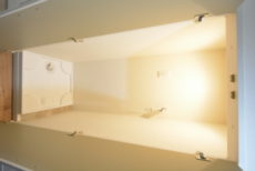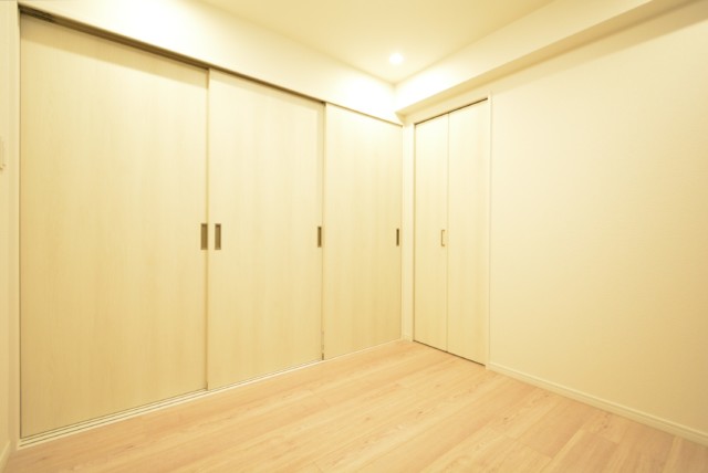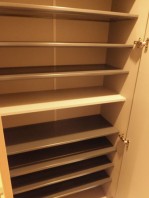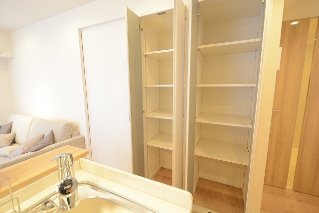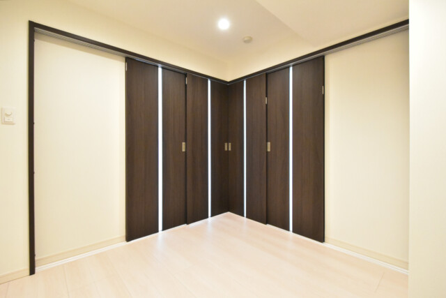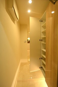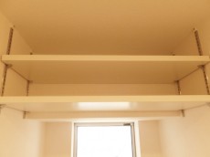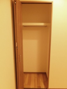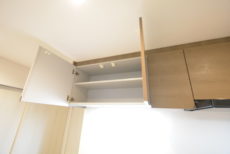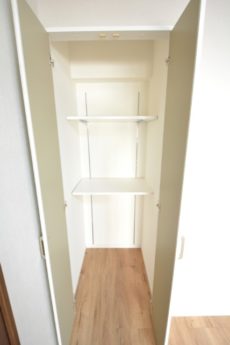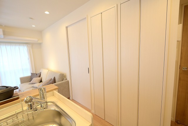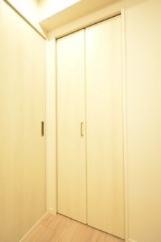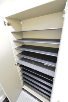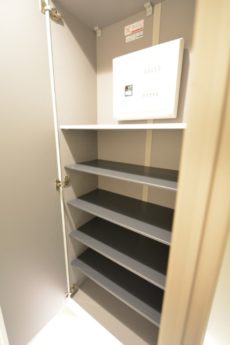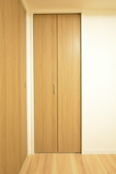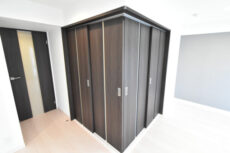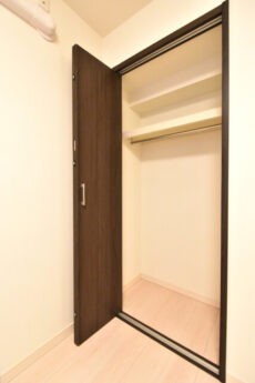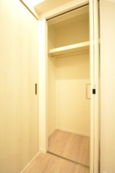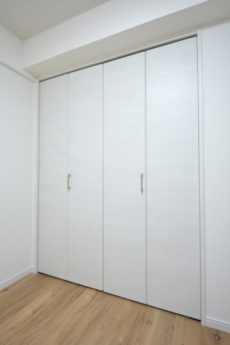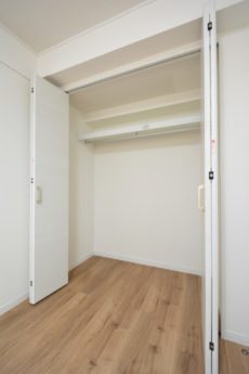 こちらもクローゼット付き。フルオープンになって中が見やすいタイプです。このタイプの収納を使うと無駄な買い物を減らせるらしいですよ。