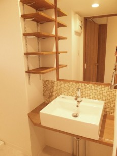 洗面台です。何ともウッドとタイルがマッチしていてオシャレな洗面台です。