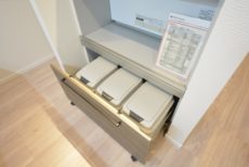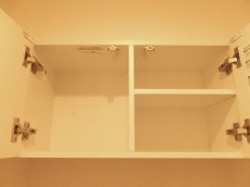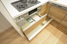 収納は調理台下のスライドキャビネットと吊戸棚。スライドキャビネットは出し入れがしやすく楽に収納出来るのが特徴です。ぎっしり詰めても中身が確認しやすいのも嬉しいですね。