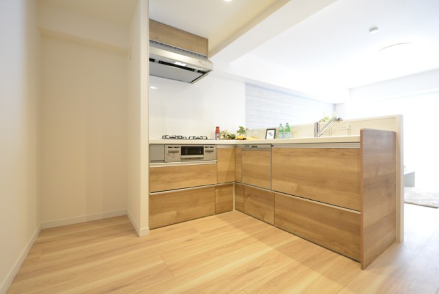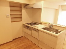 キッチンになります。こちらにもコンロ横にウッドの棚があります。