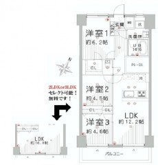 間取りのご紹介です。2LDKと1LDKのセレクト可能!56.88㎡。