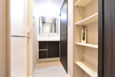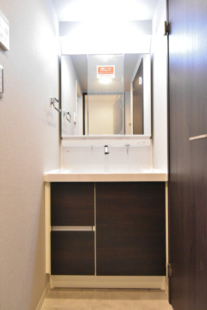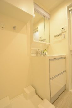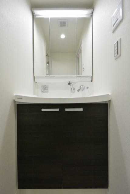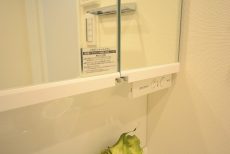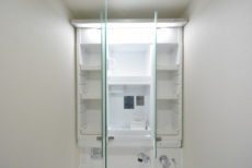 洗面化粧台は三面鏡付き。上部の照明のおかげで鏡を見る時に影になったりする事もありません。