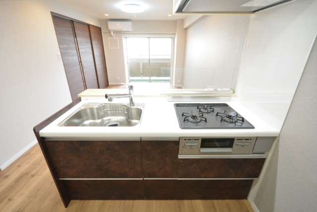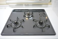 コンロは3口、グリル付。タイマーや温度設定などが可能な高機能タイプです。今ってこれが普通なんですか?友人宅でもキッチンってあまり見ないですよね・・・知らない内に自分だけ取り残されていたりして(笑)