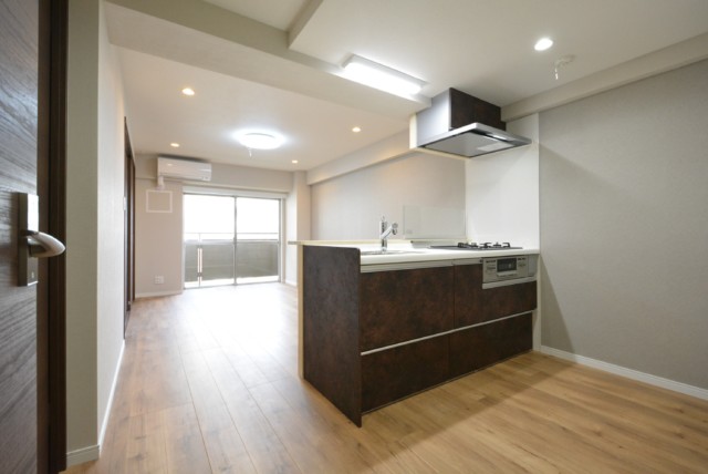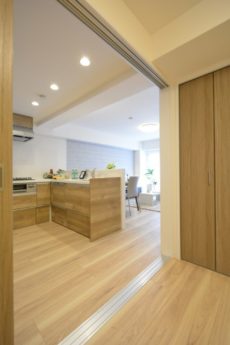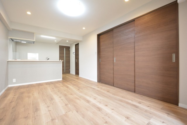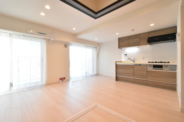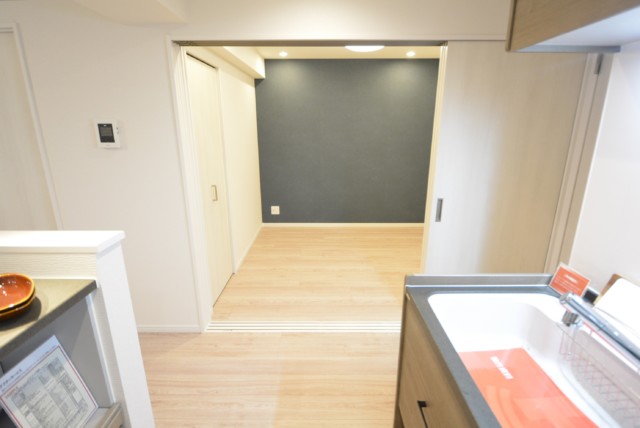 こちらは約11.5帖のリビング・ダイニング・キッチンと約4帖の洋室が合体した、約15.5帖のお部屋です。左手前のレールが見えるところが洋室部分。ここに壁があるかないかで入った時の解放感がまるで違います。