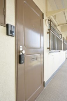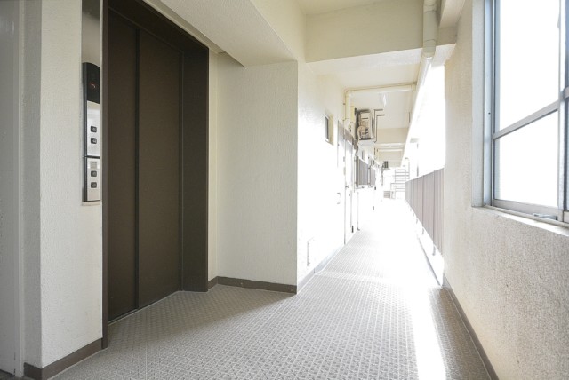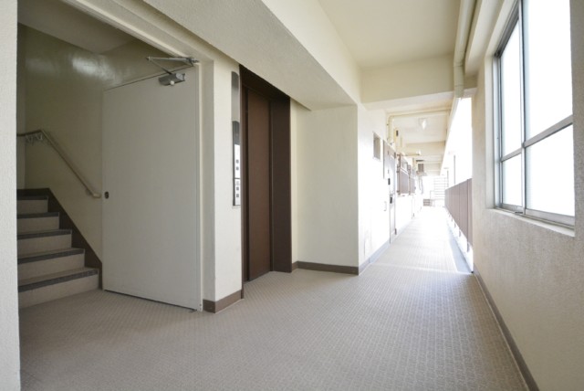 2階到着です。共用部の廊下には、目隠しもあり防犯にもなりますね。