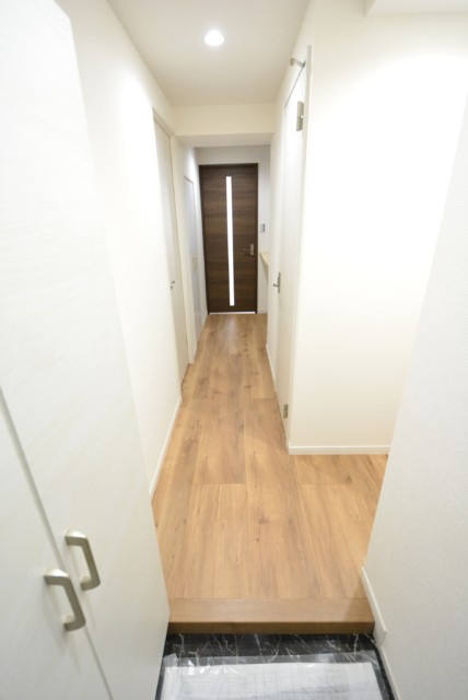 玄関から真っすぐに廊下が伸びています。明るめのフローリングにダークブラウンの扉がアクセントになっていますね。ダークブラウンのボリュームが多いからか、ナチュラルというよりはスタイリッシュな印象です。