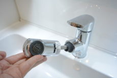 水栓は浄水機能付きシャワー水栓。切り替えるだけで気軽に美味しいお水を使えます。ノズルが伸びるのでシンクを流したりにも便利ですよ。