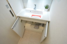 吊戸棚、鏡の裏、引き出しなど収納スペースが豊富なのでスッキリ片付きそう