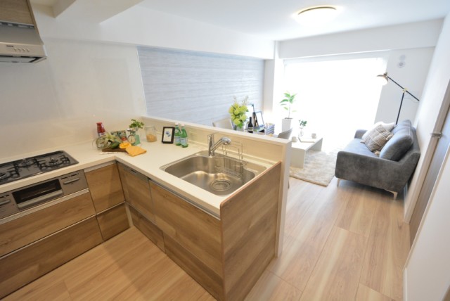キッチンは壁付けタイプ。場所をとらずにお部屋を広く使う事が出来ます。キッチン内が丸見えというデメリットもありますが、綺麗にさえしておけばなんの問題もありません。