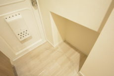 シューズボックスはトールタイプ。収納力抜群で、棚を調節すればブーツなどでもそのまま収納可能です。扉は身だしなみを整えるのに便利な姿見付き。