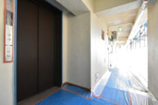 エレベーターで11階へ上がると、さっそく養生シートの嵐!どうやらこれからペンキを塗るようです。もう少し後なら綺麗になったところをご紹介できたんですけどね。壁などに触れないよう気を付けてお部屋へ向かいます。