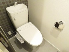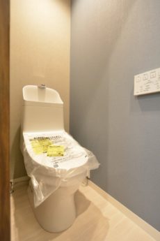 もちろん洗浄便座付き。TOTO製のウォシュレットです。棚が無いので、つっぱり棚などを設置するとトイレットペーパーなどの収納に便利ですよ。