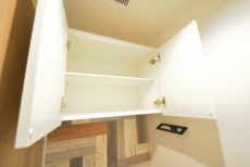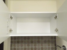 ペーパーのストックや掃除道具の保管に便利な吊戸棚が設置されています。
