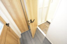玄関先は廊下。右側に洗面室、正面にシューズBOX、左側にLDKの扉があります。廊下側から順番に見ていきましょう。