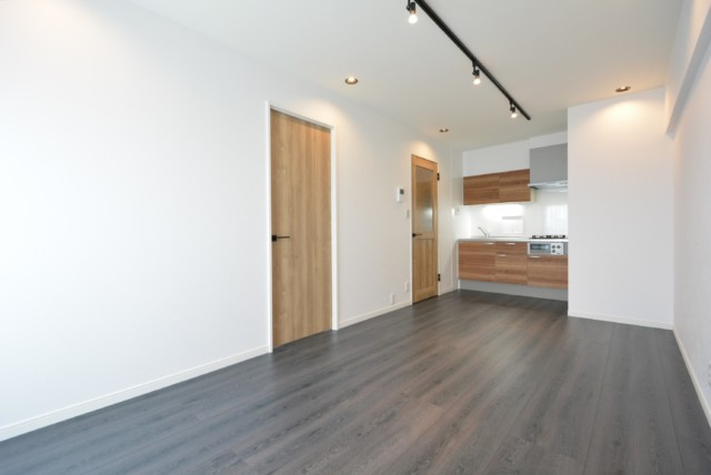 こちらは約9.5帖のリビング・ダイニング・キッチン。ダークブラウンというより黒に近いフローリングのお部屋です。個性的なフローリングのわりには、扉などには自然な色合いを使用しているからでしょうか?全体的にはナチュラルな印象に感じます。