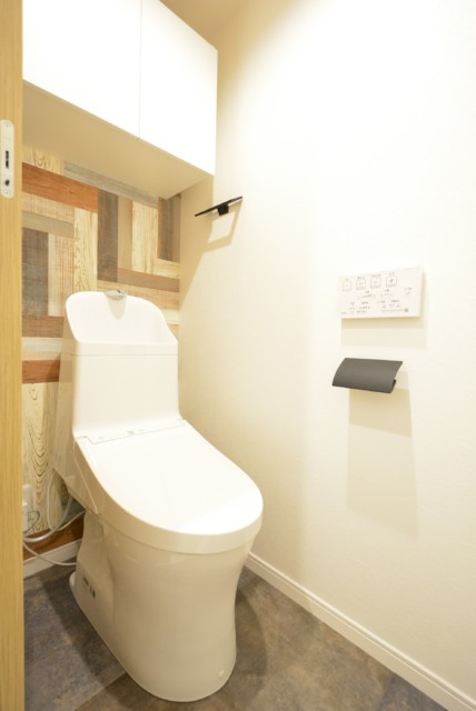 吊戸棚、温水洗浄便座付き。TOTO製のウォシュレットです。