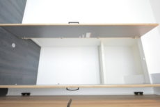 収納は調理台下と吊戸棚。扉タイプの収納はどうしても奥の方が出し入れしづらいので、収納グッズなどの助けを借りましょう!『収納の達人のワザ』とかテレビでよくやってますよね(^^)
