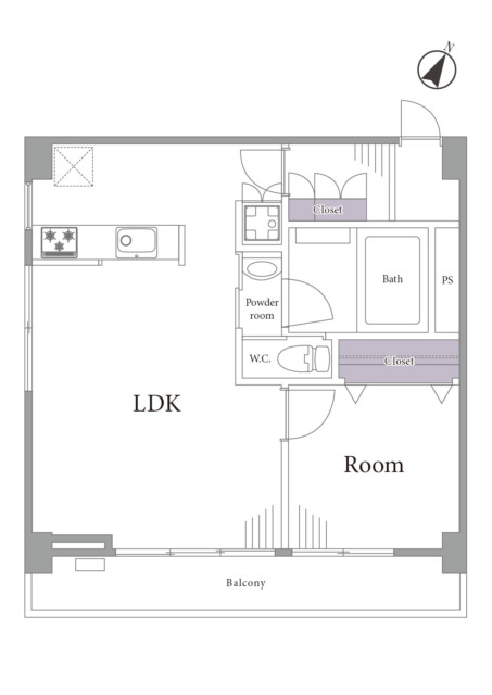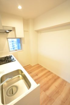 お部屋の端には壁付きのキッチン。お部屋のスペースを最大限広く使っています。カウンターキッチンは意外とスペースを取るんですよ。