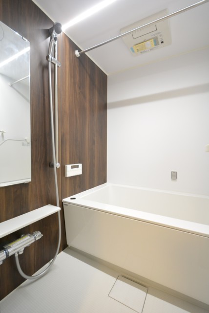 浴室はダークブラウンのアクセントパネルを使用した落ち着いた雰囲気。リラックスしたいバスタイムにはピッタリです。