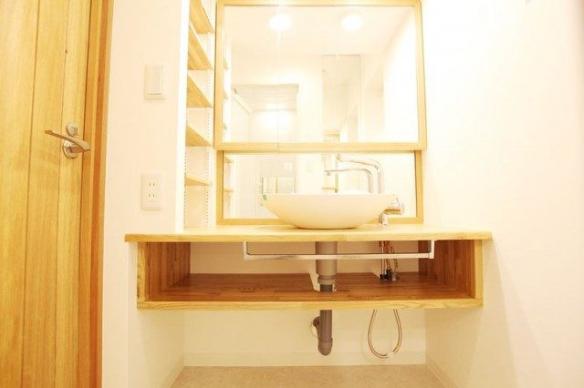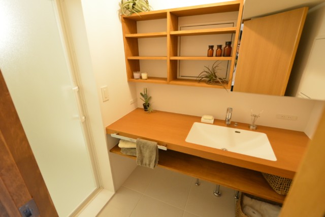 収納は棚と鏡裏のキャビネット。細々とした物が多くなりがちな洗面廻りには、豊富な収納は嬉しいですね。