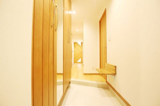 シューズボックスはトールタイプ。収納力抜群で、散らかりがちな玄関内を綺麗に保つ事が出来ますね。可動式の棚を調節すれば、ブーツなどでもそのまま収納可能ですよ。玄関に設置された人感センサーが自動的にライトを点けてくれるので、暗い中手探りでスイッチを探す必要はありません。なにより、いつも明るい玄関に帰って来れるのは嬉しいものです(*´▽`*)