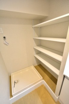 洗濯機置場は広いスペースを取っていて、長い棚が4段設置されています。