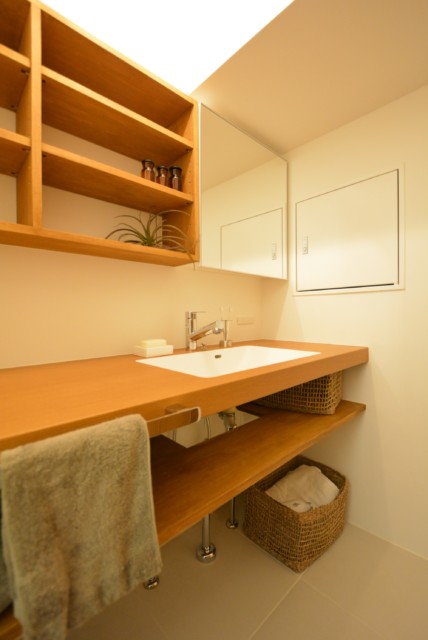 既成のユニットではない、造り付けの洗面台はやっぱりイイですね(^^♪ 幅が広く二人くらいなら並んで使えそう。朝のラッシュ時には助かります。