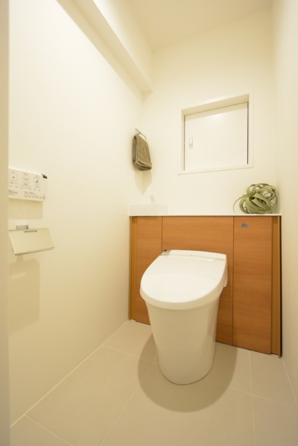 ただでさえ広いのに、タンクレスのトイレでますます広く感じます。トイレ上部の白い扉は収納ではなくパイプスペースですが、収納は別にありますのでご安心を。後ろのカウンターの下も両側が収納になっていますよ。