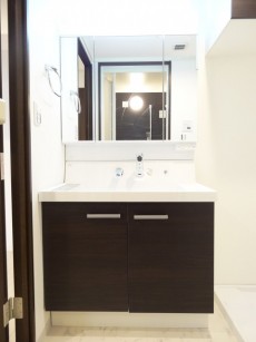 左側に洗面化粧台と洗濯機置場、右側にバスルームの並びになっています。