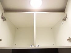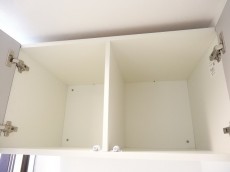 洗面化粧台のお隣は洗濯機置場。上には吊戸棚がついているので、手の届くところに洗剤が置いておけて便利です。