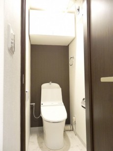 ウォシュレットと上に収納棚がついています。トイレットペーパーのストックもスッキリしまっておけますよ。