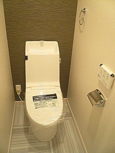 ウォシュレット付トイレです。ブラウンのアクセントクロスとクリーム色がリラックスな空間になっています。