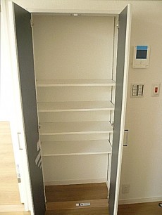 キッチン横には可動棚の収納スペースがあり重宝します。