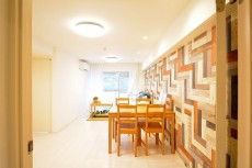 バルコニーに面しているリビングダイニングキッチンです。光と風が家族の憩いの場を心地よくしてくれそうです。レンガ調のアクセントクロスと上部にある照明がお部屋をよりおしゃれに演出してくれています。