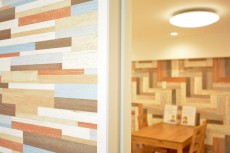 こちらのお部屋も一面がカラフルでインパクトのあるクロスが貼られています。