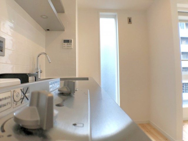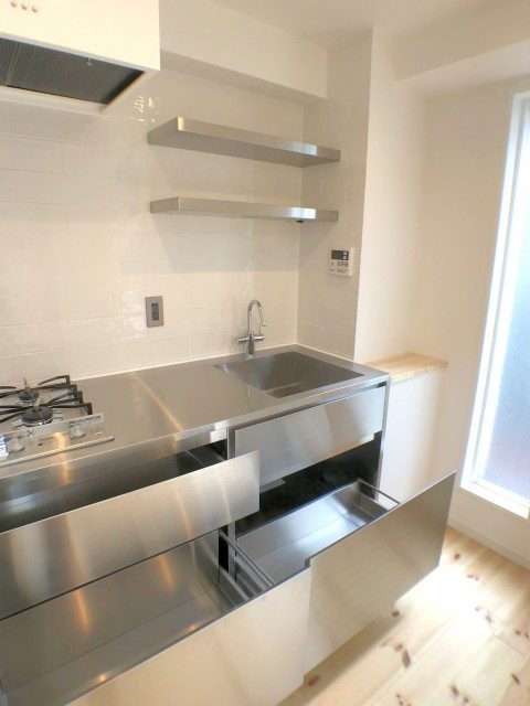 ご覧の通りステンレスキッチンです。(業務用っぽさを感じる方もいるようですが意外と高価なんですよ・・・)