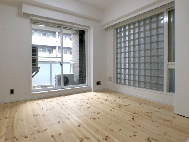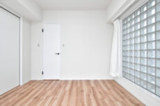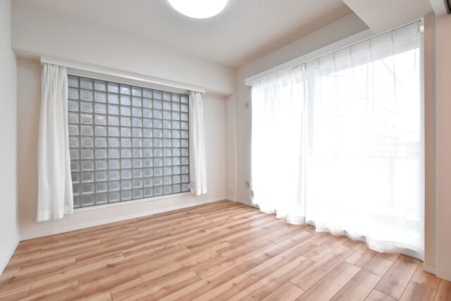 南東の二面採光のお部屋です。東側はガラスブロックなので開けることは出来ませんが、カーテンを開けたままでも外からの目を気にする必要がありません。ガラスブロックは丈夫な上、中はほぼ真空になっているので見た目以上に防音性、断熱性、防犯性が高いそうですよ。