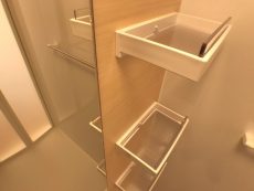 サイドにビルドインタイプの棚も付いているので、歯ブラシなどの小物の置き場所にも困ることは無さそうです ( ´∀`)b
