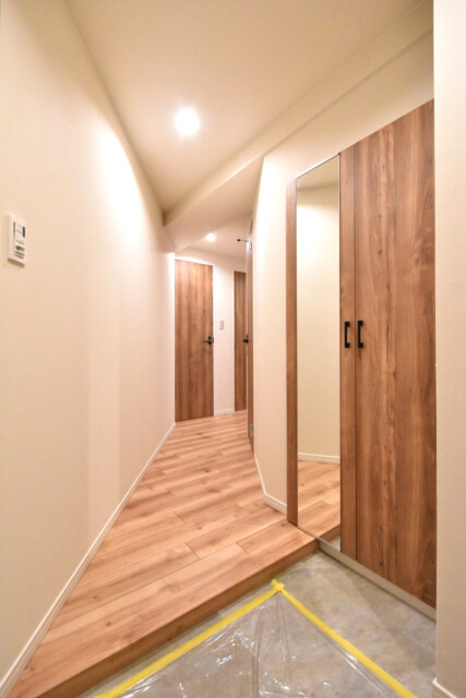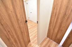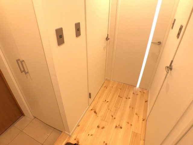 玄関からは斜めに廊下が伸びています。リノベーション済みということで綺麗ですね。上り口は段差が小さめ。斜めに切ってあるので幅も広く、小さなお子様連れのときや荷物が多いときにはとても助かります。