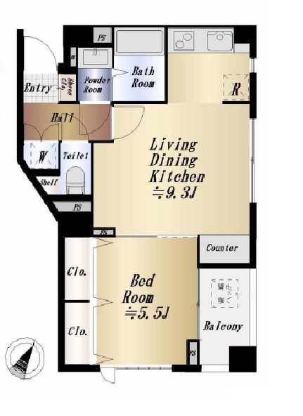 今回ご紹介するお部屋は5階、専有面積39.81㎡の1LDK。お一人暮らしの方にお勧めのお部屋です。少し変わった形をしていますがどんな感じか楽しみですね。では、早速行ってみましょう!