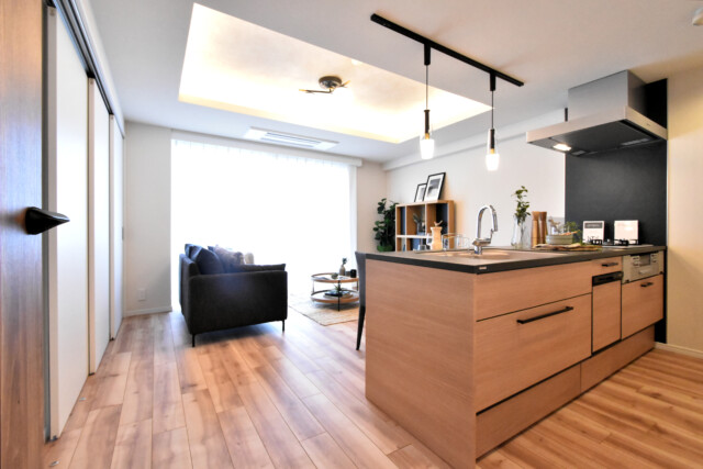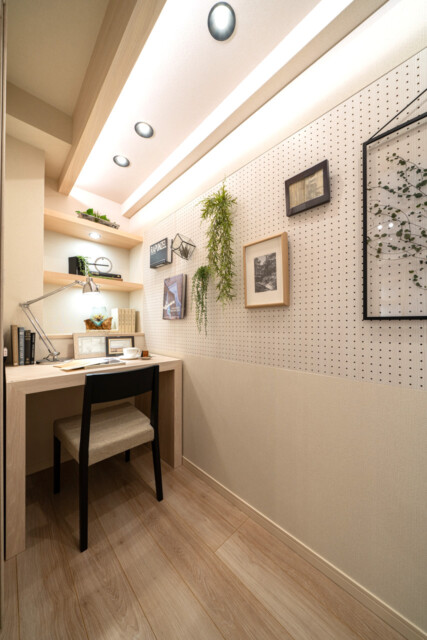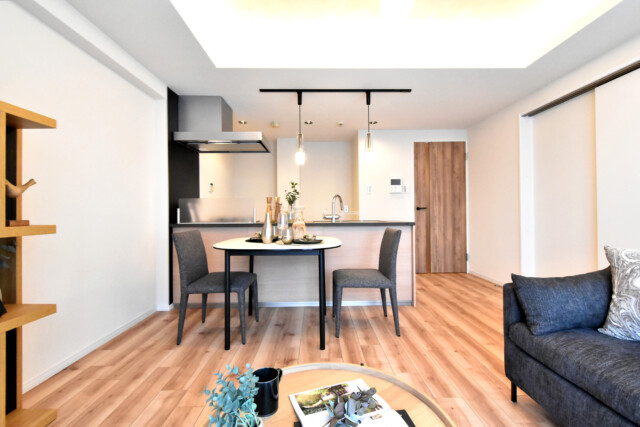 南向きバルコニーに面した明るいお部屋です。内装は木目にモノトーンを合わせたナチュラルモダン。このタイプはインテリアによって幅広いイメージを創り出すことが出来ます。家具などで木目の部分を増やせば温かみのあるナチュラルな雰囲気になりますし、白、黒、グレーなどモノトーンの濃度でも全然雰囲気が変わってきます。ディスプレイは黒やダークグレーを使ったシャープな印象になっていますね。