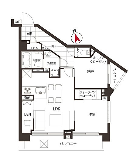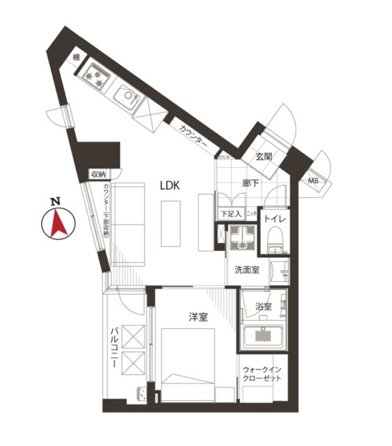 通常のこのタイプのお部屋より幅があるので全体的にゆったりとした印象です。ただし、キッチンから窓までの距離は平均的なので家具のサイズには注意が必要です。どっちつかずにならないよう、リビング、ダイニングのどちらかにウェイトをおいたレイアウトがいいかもしれませんね。