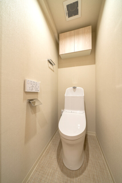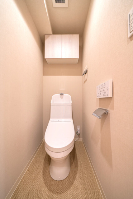 トイレはTOTO製の洗浄機能付き。掃除道具やトイレットペーパーのストックなどの収納に便利な吊戸棚も付いています。